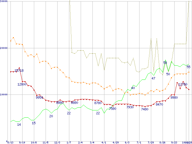 ※このグラフは過去のデータも税率5%相当に調整した税込み相当額のグラフです。 税率変更や、総額表示方式導入(2004年4月)の影響は除いています。 | | | ●凡例 | 最安値 (点線部は販売店未確認 または未調査) | 平均値 | 最高値 | ショップ数 |