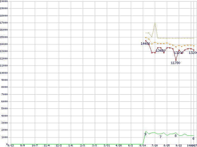 ※このグラフは過去のデータも税率5%相当に調整した税込み相当額のグラフです。 税率変更や、総額表示方式導入(2004年4月)の影響は除いています。 | | | ●凡例 | 最安値 (点線部は販売店未確認 または未調査) | 平均値 | 最高値 | ショップ数 |