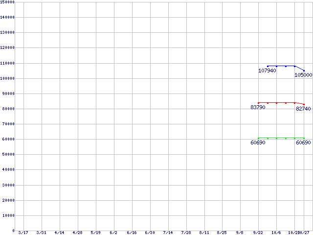 | Socket F (FSB 1000MHz,L2 1MBx2,Dual Core,TDP 68W)の最安値推移 | | | (2006年3月17日~2006年10月27日) |