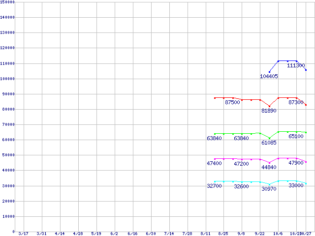 | Socket AM2 (FSB 1000MHz,L2 1MBx2,Dual Core,TDP 103W)の最安値推移 | | | (2006年3月17日~2006年10月27日) |