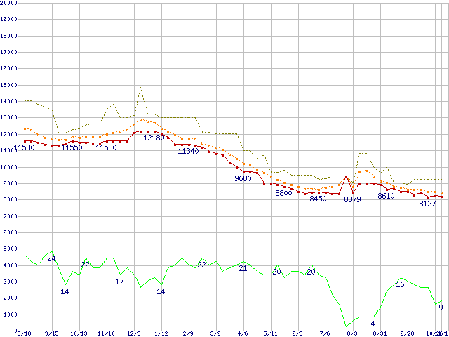 ※このグラフは過去のデータも税率5%相当に調整した税込み相当額のグラフです。 税率変更や、総額表示方式導入(2004年4月)の影響は除いています。 | | | ●凡例 | 最安値 (点線部は販売店未確認 または未調査) | 平均値 | 最高値 | ショップ数 |