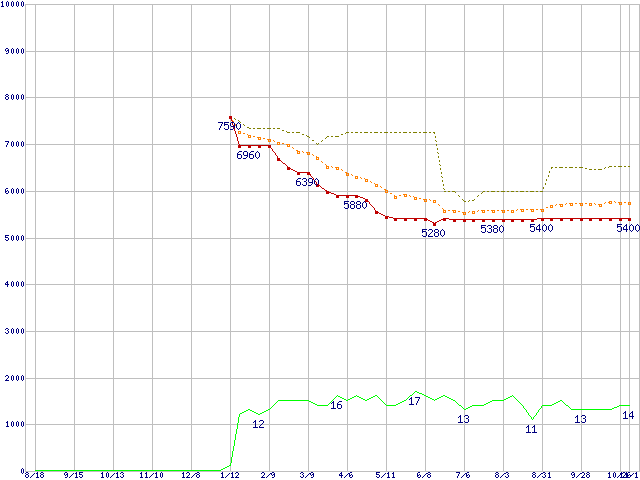 ※このグラフは過去のデータも税率5%相当に調整した税込み相当額のグラフです。 税率変更や、総額表示方式導入(2004年4月)の影響は除いています。 | | | ●凡例 | 最安値 (点線部は販売店未確認 または未調査) | 平均値 | 最高値 | ショップ数 |