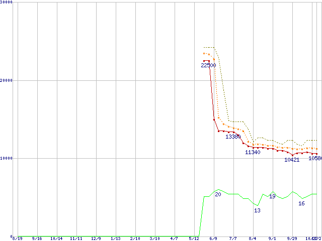 ※このグラフは過去のデータも税率5%相当に調整した税込み相当額のグラフです。 税率変更や、総額表示方式導入(2004年4月)の影響は除いています。 | | | ●凡例 | 最安値 (点線部は販売店未確認 または未調査) | 平均値 | 最高値 | ショップ数 |