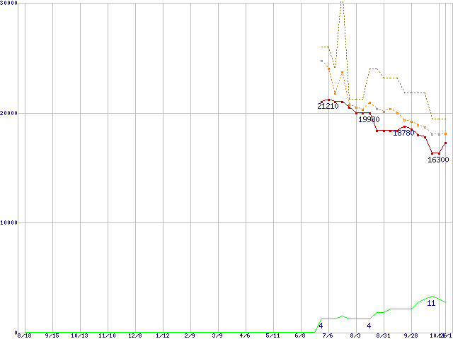 ※このグラフは過去のデータも税率5%相当に調整した税込み相当額のグラフです。 税率変更や、総額表示方式導入(2004年4月)の影響は除いています。 | | | ●凡例 | 最安値 (点線部は販売店未確認 または未調査) | 平均値 | 最高値 | ショップ数 |
