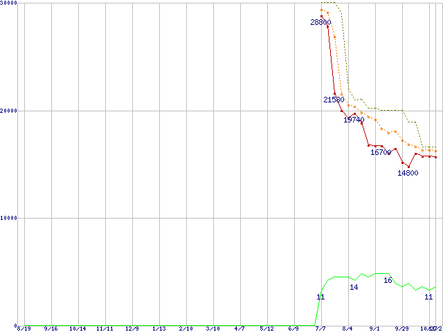 ※このグラフは過去のデータも税率5%相当に調整した税込み相当額のグラフです。 税率変更や、総額表示方式導入(2004年4月)の影響は除いています。 | | | ●凡例 | 最安値 (点線部は販売店未確認 または未調査) | 平均値 | 最高値 | ショップ数 |