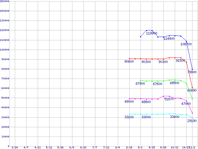 | Socket F (FSB 1000MHz,L2 1MBx2,Dual Core,TDP 95W)の最安値推移 | | | (2006年3月24日~2006年11月2日) |