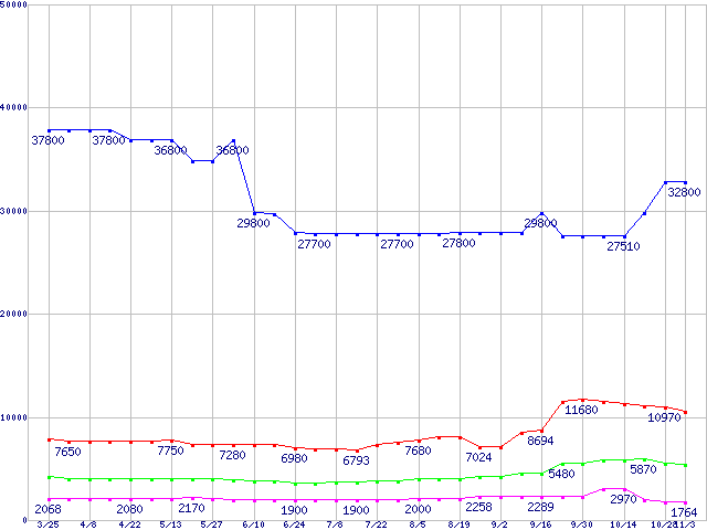 PC2-4200*(DDR2-533) DDR2 SDRAM DIMMの最安値推移