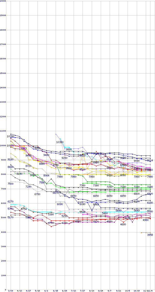 | HDD主要製品(最安値1万円未満)の最安値推移 | | | (2006年3月30日~2006年11月9日) |