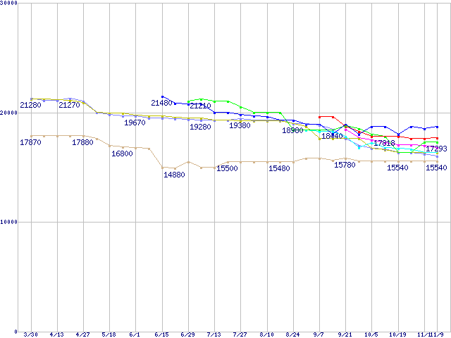 HDD主要製品(最安値1万5千円~2万円未満)の最安値推移