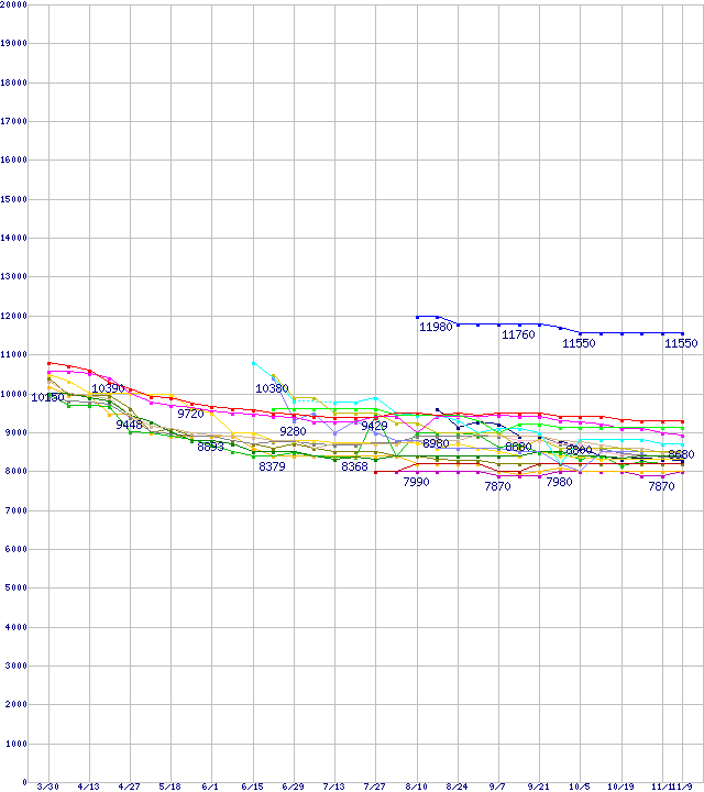 | HDD 250~300GB未満の最安値推移 | | | (2006年3月30日~2006年11月9日) |