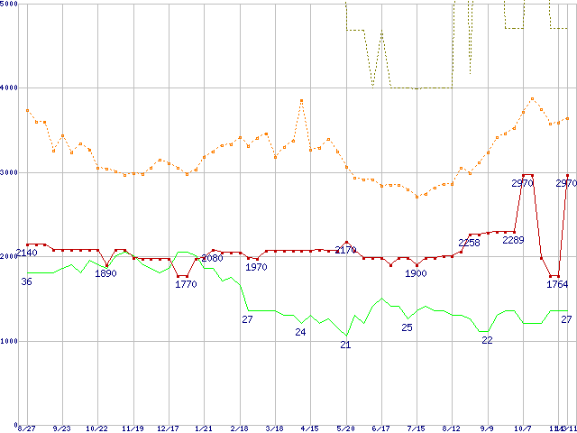 ※このグラフは過去のデータも税率5%相当に調整した税込み相当額のグラフです。 税率変更や、総額表示方式導入(2004年4月)の影響は除いています。 | | | ●凡例 | 最安値 (点線部は販売店未確認 または未調査) | 平均値 | 最高値 | ショップ数 |