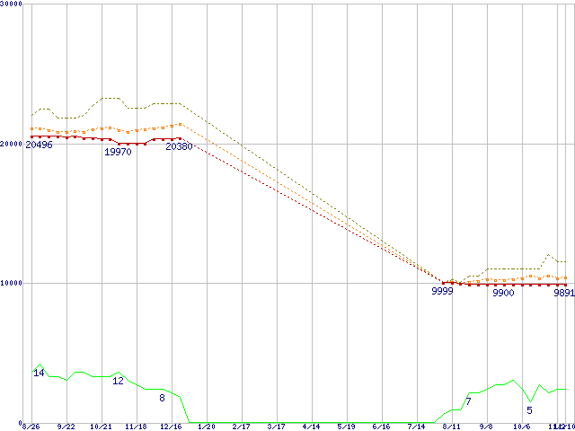 ※このグラフは過去のデータも税率5%相当に調整した税込み相当額のグラフです。 税率変更や、総額表示方式導入(2004年4月)の影響は除いています。 | | | ●凡例 | 最安値 (点線部は販売店未確認 または未調査) | 平均値 | 最高値 | ショップ数 |