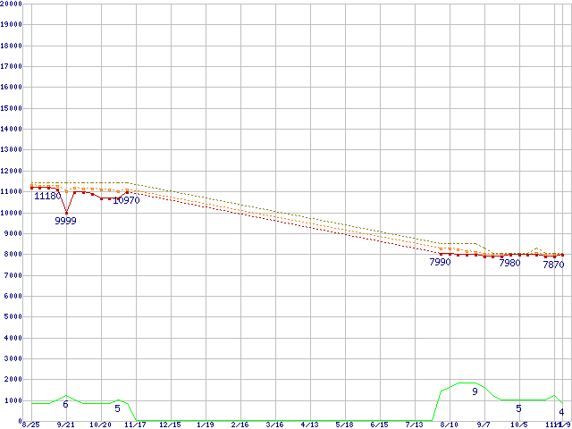 ※このグラフは過去のデータも税率5%相当に調整した税込み相当額のグラフです。 税率変更や、総額表示方式導入(2004年4月)の影響は除いています。 | | | ●凡例 | 最安値 (点線部は販売店未確認 または未調査) | 平均値 | 最高値 | ショップ数 |