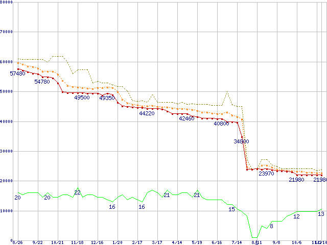 ※このグラフは過去のデータも税率5%相当に調整した税込み相当額のグラフです。 税率変更や、総額表示方式導入(2004年4月)の影響は除いています。 | | | ●凡例 | 最安値 (点線部は販売店未確認 または未調査) | 平均値 | 最高値 | ショップ数 |