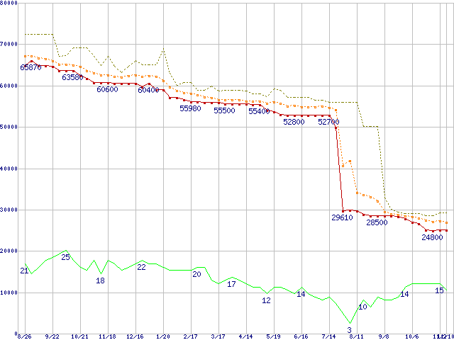 ※このグラフは過去のデータも税率5%相当に調整した税込み相当額のグラフです。 税率変更や、総額表示方式導入(2004年4月)の影響は除いています。 | | | ●凡例 | 最安値 (点線部は販売店未確認 または未調査) | 平均値 | 最高値 | ショップ数 |
