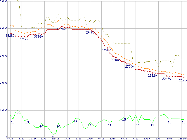 ※このグラフは過去のデータも税率5%相当に調整した税込み相当額のグラフです。 税率変更や、総額表示方式導入(2004年4月)の影響は除いています。 | | | ●凡例 | 最安値 (点線部は販売店未確認 または未調査) | 平均値 | 最高値 | ショップ数 |