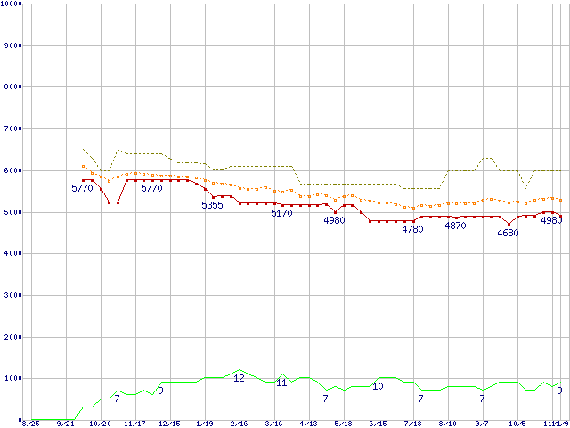 ※このグラフは過去のデータも税率5%相当に調整した税込み相当額のグラフです。 税率変更や、総額表示方式導入(2004年4月)の影響は除いています。 | | | ●凡例 | 最安値 (点線部は販売店未確認 または未調査) | 平均値 | 最高値 | ショップ数 |