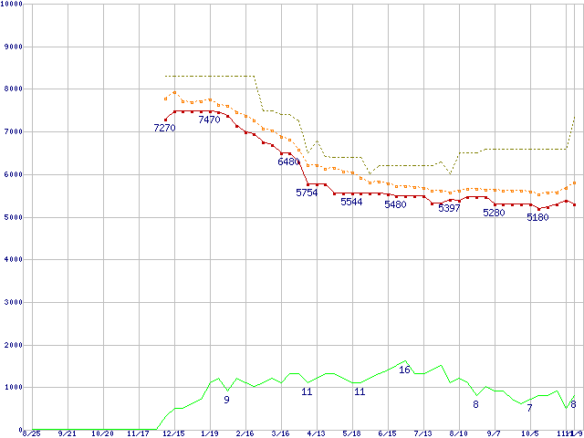 ※このグラフは過去のデータも税率5%相当に調整した税込み相当額のグラフです。 税率変更や、総額表示方式導入(2004年4月)の影響は除いています。 | | | ●凡例 | 最安値 (点線部は販売店未確認 または未調査) | 平均値 | 最高値 | ショップ数 |
