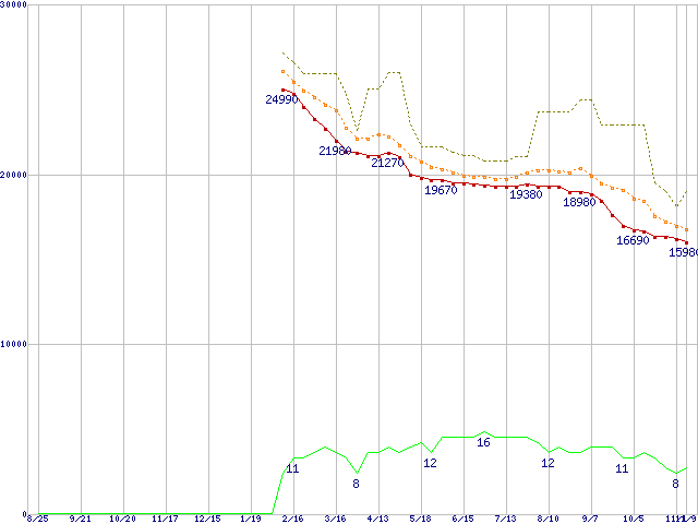 ※このグラフは過去のデータも税率5%相当に調整した税込み相当額のグラフです。 税率変更や、総額表示方式導入(2004年4月)の影響は除いています。 | | | ●凡例 | 最安値 (点線部は販売店未確認 または未調査) | 平均値 | 最高値 | ショップ数 |