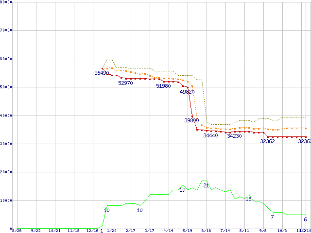 ※このグラフは過去のデータも税率5%相当に調整した税込み相当額のグラフです。 税率変更や、総額表示方式導入(2004年4月)の影響は除いています。 | | | ●凡例 | 最安値 (点線部は販売店未確認 または未調査) | 平均値 | 最高値 | ショップ数 |