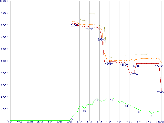 ※このグラフは過去のデータも税率5%相当に調整した税込み相当額のグラフです。 税率変更や、総額表示方式導入(2004年4月)の影響は除いています。 | | | ●凡例 | 最安値 (点線部は販売店未確認 または未調査) | 平均値 | 最高値 | ショップ数 |