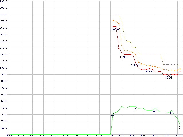 ※このグラフは過去のデータも税率5%相当に調整した税込み相当額のグラフです。 税率変更や、総額表示方式導入(2004年4月)の影響は除いています。 | | | ●凡例 | 最安値 (点線部は販売店未確認 または未調査) | 平均値 | 最高値 | ショップ数 |