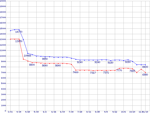 Core Duo向けSocket 478 (FSB 533MHz,L2 1MB)の最安値推移