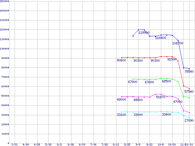 | Socket F (FSB 1000MHz,L2 1MBx2,Dual Core,TDP 95W)の最安値推移 | | | (2006年3月31日~2006年11月10日) |