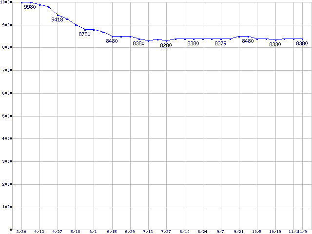 | Deskstar T7K250 (7200rpm,Serial ATA II/3Gbps)の最安値推移 | | | (2006年3月30日~2006年11月9日) |
