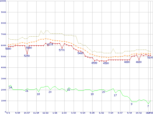 ※このグラフは過去のデータも税率5%相当に調整した税込み相当額のグラフです。 税率変更や、総額表示方式導入(2004年4月)の影響は除いています。 | | | ●凡例 | 最安値 (点線部は販売店未確認 または未調査) | 平均値 | 最高値 | ショップ数 |