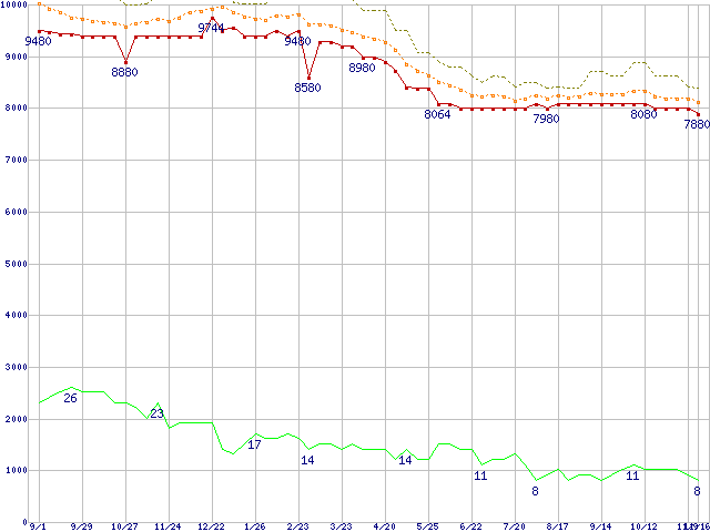 ※このグラフは過去のデータも税率5%相当に調整した税込み相当額のグラフです。 税率変更や、総額表示方式導入(2004年4月)の影響は除いています。 | | | ●凡例 | 最安値 (点線部は販売店未確認 または未調査) | 平均値 | 最高値 | ショップ数 |