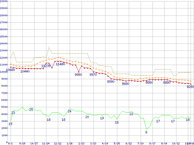 ※このグラフは過去のデータも税率5%相当に調整した税込み相当額のグラフです。 税率変更や、総額表示方式導入(2004年4月)の影響は除いています。 | | | ●凡例 | 最安値 (点線部は販売店未確認 または未調査) | 平均値 | 最高値 | ショップ数 |