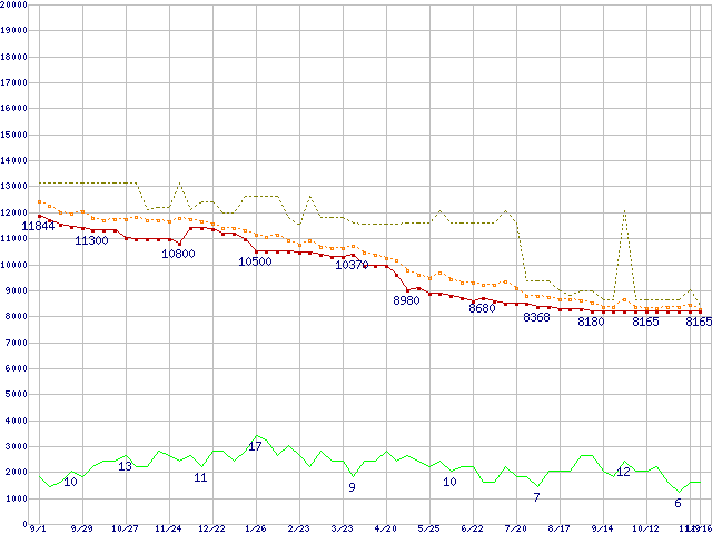 ※このグラフは過去のデータも税率5%相当に調整した税込み相当額のグラフです。 税率変更や、総額表示方式導入(2004年4月)の影響は除いています。 | | | ●凡例 | 最安値 (点線部は販売店未確認 または未調査) | 平均値 | 最高値 | ショップ数 |