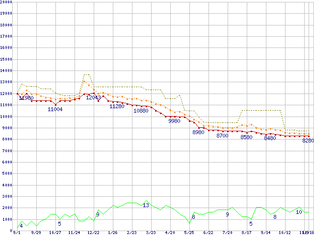 ※このグラフは過去のデータも税率5%相当に調整した税込み相当額のグラフです。 税率変更や、総額表示方式導入(2004年4月)の影響は除いています。 | | | ●凡例 | 最安値 (点線部は販売店未確認 または未調査) | 平均値 | 最高値 | ショップ数 |