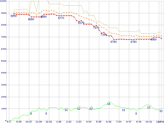 ※このグラフは過去のデータも税率5%相当に調整した税込み相当額のグラフです。 税率変更や、総額表示方式導入(2004年4月)の影響は除いています。 | | | ●凡例 | 最安値 (点線部は販売店未確認 または未調査) | 平均値 | 最高値 | ショップ数 |