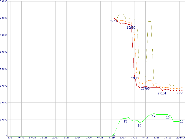 ※このグラフは過去のデータも税率5%相当に調整した税込み相当額のグラフです。 税率変更や、総額表示方式導入(2004年4月)の影響は除いています。 | | | ●凡例 | 最安値 (点線部は販売店未確認 または未調査) | 平均値 | 最高値 | ショップ数 |