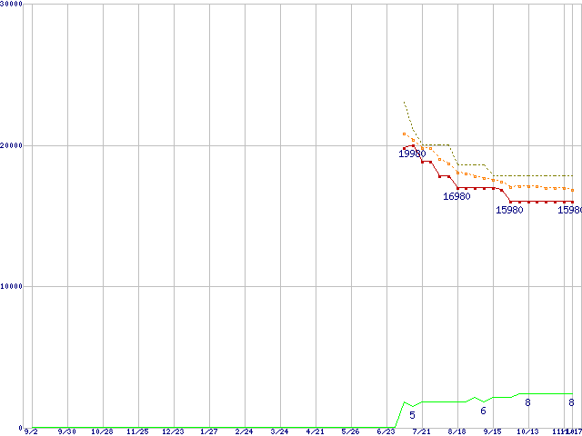 ※このグラフは過去のデータも税率5%相当に調整した税込み相当額のグラフです。 税率変更や、総額表示方式導入(2004年4月)の影響は除いています。 | | | ●凡例 | 最安値 (点線部は販売店未確認 または未調査) | 平均値 | 最高値 | ショップ数 |