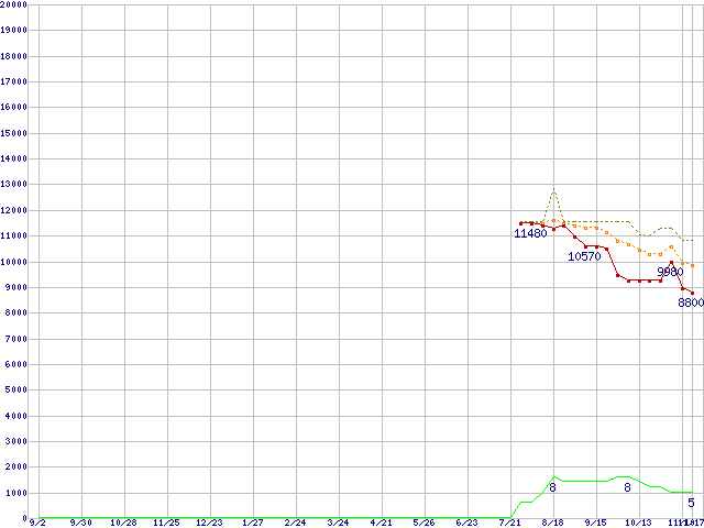 ※このグラフは過去のデータも税率5%相当に調整した税込み相当額のグラフです。 税率変更や、総額表示方式導入(2004年4月)の影響は除いています。 | | | ●凡例 | 最安値 (点線部は販売店未確認 または未調査) | 平均値 | 最高値 | ショップ数 |