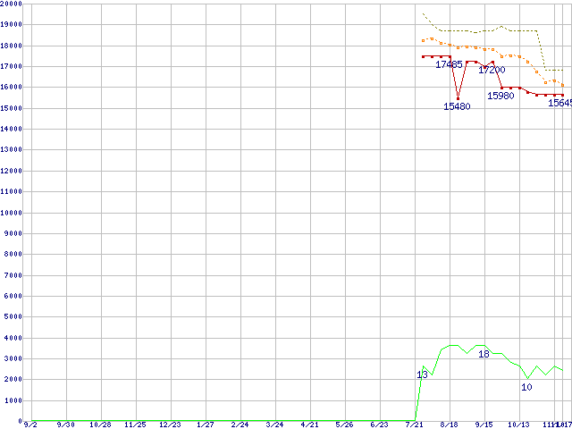 ※このグラフは過去のデータも税率5%相当に調整した税込み相当額のグラフです。 税率変更や、総額表示方式導入(2004年4月)の影響は除いています。 | | | ●凡例 | 最安値 (点線部は販売店未確認 または未調査) | 平均値 | 最高値 | ショップ数 |