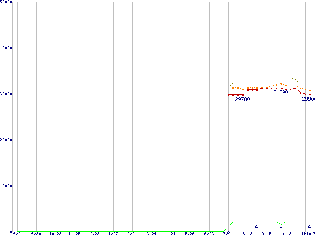 ※このグラフは過去のデータも税率5%相当に調整した税込み相当額のグラフです。 税率変更や、総額表示方式導入(2004年4月)の影響は除いています。 | | | ●凡例 | 最安値 (点線部は販売店未確認 または未調査) | 平均値 | 最高値 | ショップ数 |