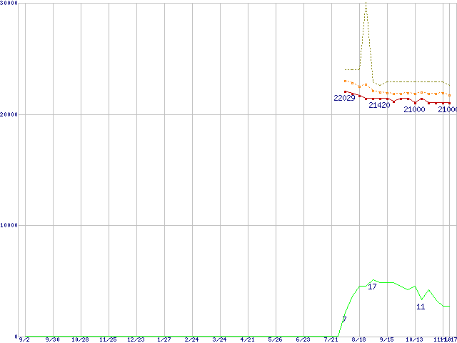 ※このグラフは過去のデータも税率5%相当に調整した税込み相当額のグラフです。 税率変更や、総額表示方式導入(2004年4月)の影響は除いています。 | | | ●凡例 | 最安値 (点線部は販売店未確認 または未調査) | 平均値 | 最高値 | ショップ数 |