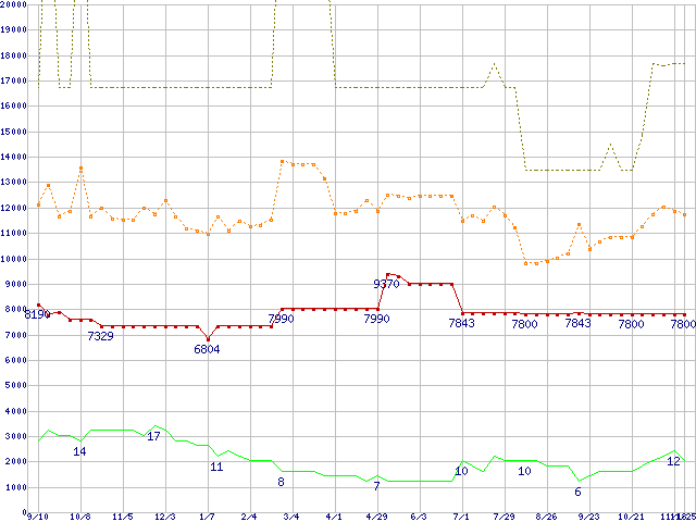 ※このグラフは過去のデータも税率5%相当に調整した税込み相当額のグラフです。 税率変更や、総額表示方式導入(2004年4月)の影響は除いています。 | | | ●凡例 | 最安値 (点線部は販売店未確認 または未調査) | 平均値 | 最高値 | ショップ数 |