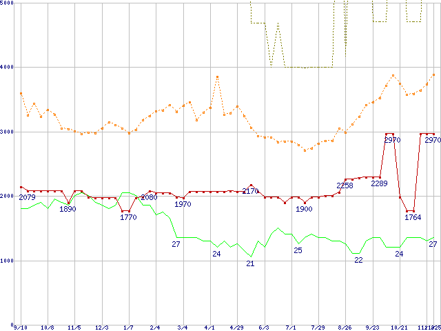 ※このグラフは過去のデータも税率5%相当に調整した税込み相当額のグラフです。 税率変更や、総額表示方式導入(2004年4月)の影響は除いています。 | | | ●凡例 | 最安値 (点線部は販売店未確認 または未調査) | 平均値 | 最高値 | ショップ数 |