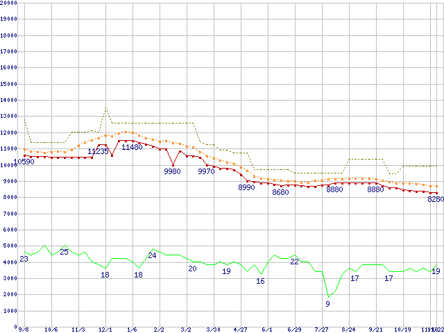 ※このグラフは過去のデータも税率5%相当に調整した税込み相当額のグラフです。 税率変更や、総額表示方式導入(2004年4月)の影響は除いています。 | | | ●凡例 | 最安値 (点線部は販売店未確認 または未調査) | 平均値 | 最高値 | ショップ数 |