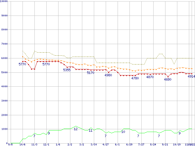 ※このグラフは過去のデータも税率5%相当に調整した税込み相当額のグラフです。 税率変更や、総額表示方式導入(2004年4月)の影響は除いています。 | | | ●凡例 | 最安値 (点線部は販売店未確認 または未調査) | 平均値 | 最高値 | ショップ数 |