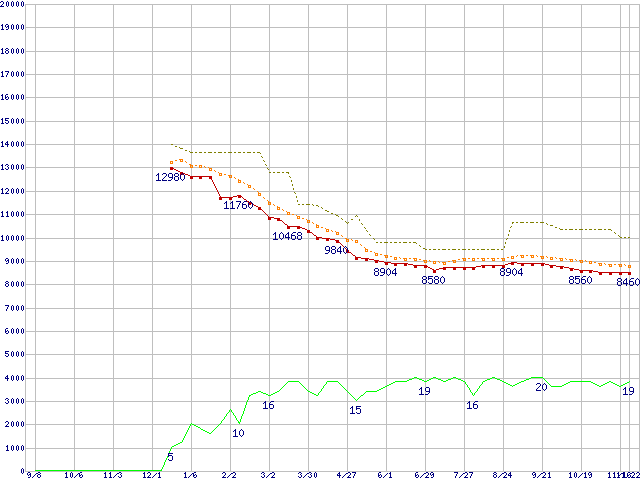 ※このグラフは過去のデータも税率5%相当に調整した税込み相当額のグラフです。 税率変更や、総額表示方式導入(2004年4月)の影響は除いています。 | | | ●凡例 | 最安値 (点線部は販売店未確認 または未調査) | 平均値 | 最高値 | ショップ数 |