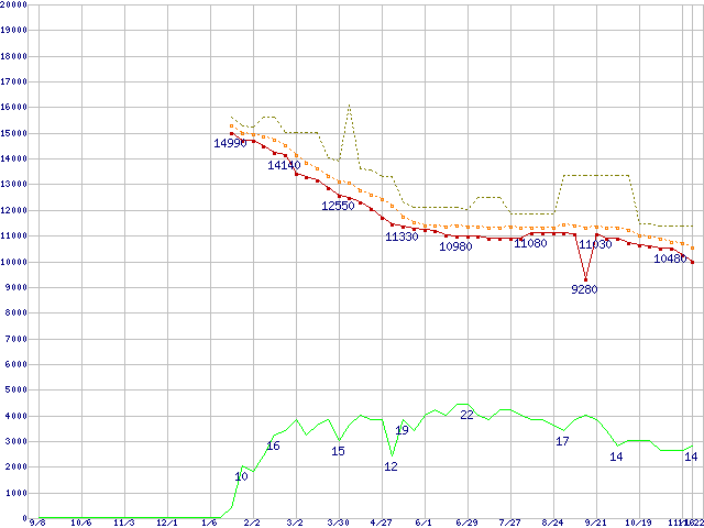 ※このグラフは過去のデータも税率5%相当に調整した税込み相当額のグラフです。 税率変更や、総額表示方式導入(2004年4月)の影響は除いています。 | | | ●凡例 | 最安値 (点線部は販売店未確認 または未調査) | 平均値 | 最高値 | ショップ数 |