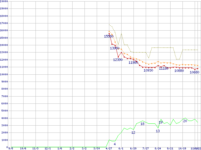 ※このグラフは過去のデータも税率5%相当に調整した税込み相当額のグラフです。 税率変更や、総額表示方式導入(2004年4月)の影響は除いています。 | | | ●凡例 | 最安値 (点線部は販売店未確認 または未調査) | 平均値 | 最高値 | ショップ数 |