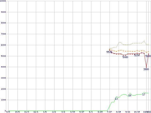 ※このグラフは過去のデータも税率5%相当に調整した税込み相当額のグラフです。 税率変更や、総額表示方式導入(2004年4月)の影響は除いています。 | | | ●凡例 | 最安値 (点線部は販売店未確認 または未調査) | 平均値 | 最高値 | ショップ数 |