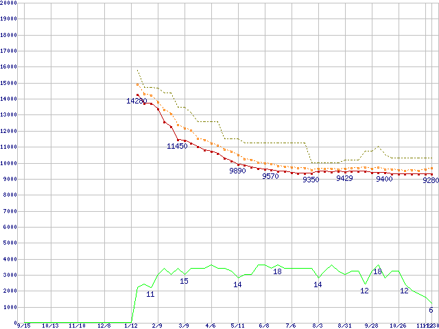※このグラフは過去のデータも税率5%相当に調整した税込み相当額のグラフです。 税率変更や、総額表示方式導入(2004年4月)の影響は除いています。 | | | ●凡例 | 最安値 (点線部は販売店未確認 または未調査) | 平均値 | 最高値 | ショップ数 |
